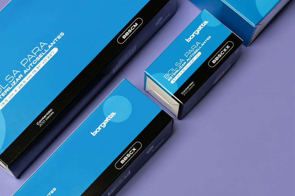 Sellado de máxima seguridad en las periferias y en las esquinas, papel grado médico de mayor grosor y banda adhesiva de autosellado. Aseguran el instrumental para una correcta esterilización en autoclave y con indicadores de procesos.