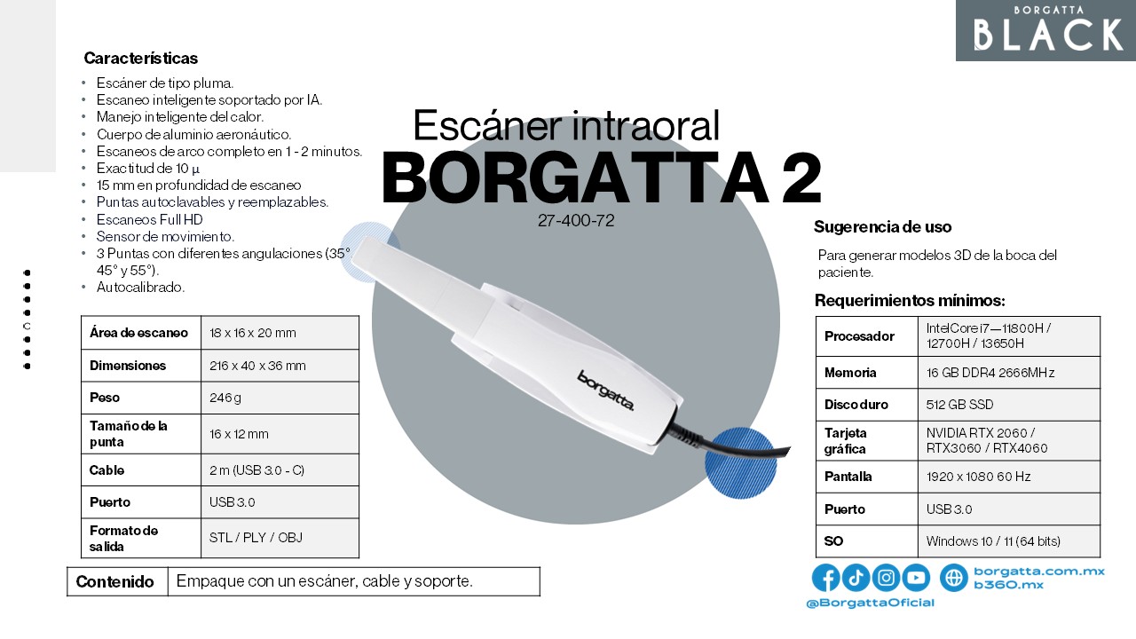 El esencial para la odontología general, ortodoncia y odontopediatría. Escanea una arcada en 90 segundos* Su definición es HD, con una precisión de 10μm y un sistema de antiempañamiento y enfriamiento. Su pedal te permite iniciar, pausar y reactivar el escaneo. Ideal para: modelos de estudios y férulas. Cuenta con dos programas especializados: el primero es un simulador de ortodoncia que, en solo 5 minutos, proporciona información sobre puntos de contacto, extracciones, movimientos de torque, y ofrece al paciente una visualización virtual de su diagnóstico ortodóntico. El segundo es un software de diseño enfocado en restauraciones individuales, como coronas, inlays y onlays, facilitando la planificación y ejecución de tratamientos dentales precisos. Incluye: 3 puntas universales, 1 distal y 1 mesial. *El tiempo dependerá de la curva de aprendizaje y habilidad de uso.